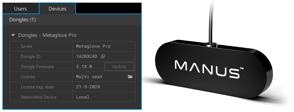 The software license is part of the wireless dongle. Information about the Wireless Dongle can be found in MANUS Core.