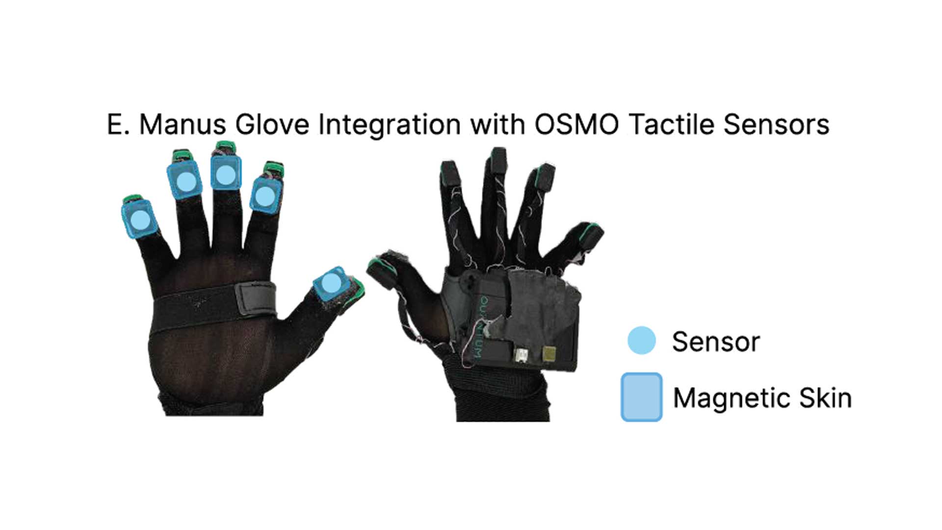 The OSMO tactile glove integrates twelve three axis magnetic tactile sensors across the fingertips and palm to capture both normal and shear forces. To prevent hand tracking degradation during contact, where visual occlusion frequently occurs, MANUS Quantum Metagloves were selected for integration with the OSMO system.